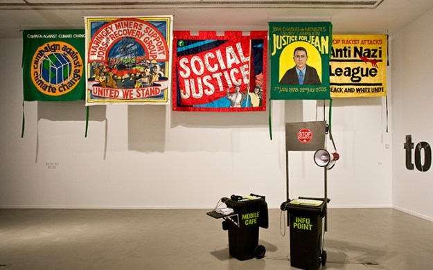 Based on the testimony offered by the works of the artists and collectives DosJotas, Ed Hall, Nicoline van Harskamp, Sharon Hayes, noaz, Oliver Ressler, Superflex and Todo por la praxis, this project dissects the anatomy of a demonstration piece by piece: the actors— demonstrators, authorities and the media; the supporting props they use—banners, customised clothing, slogans, etc.; and the stage on which they perform, underscoring the value of the public arena—be it in Madrid, London, New York, Athens or Copenhagen—as a place for sharing and increasing the visibility of these actions.